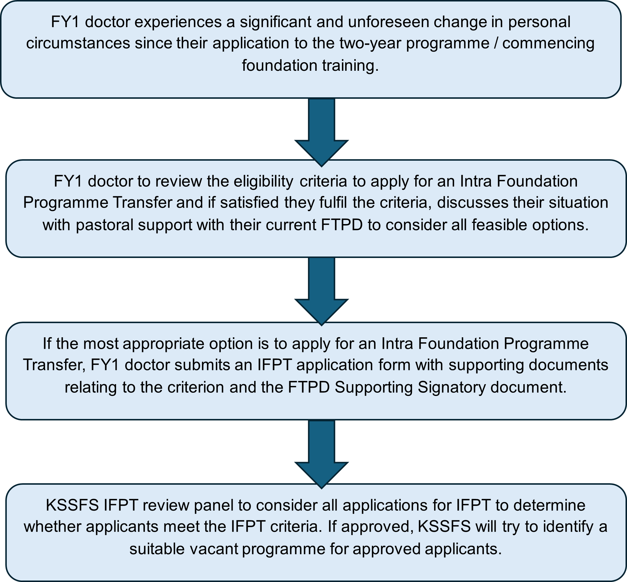 The KSSFS IFPT process has been designed to support transfers for current FY1 Resident Doctors (RD) who need to train in a particular geography within KSS and whose individual circumstances have changed since the point of initial application/allocation to a 2-year foundation programme.